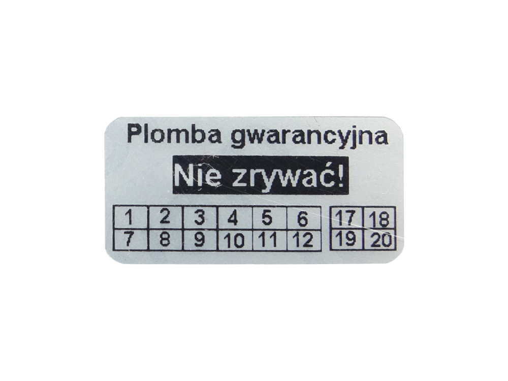 Oferujemy wykonanie 1000 sztuk plomb gwarancyjnych w rozmiarze 20x10mm, z srebrnej matowej folii VOID.