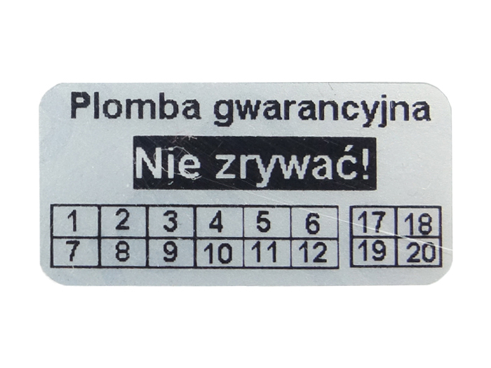 Oferujemy wykonanie 250 sztuk plomb gwarancyjnych w rozmiarze 20x8mm, z srebrnej matowej folii VOID.