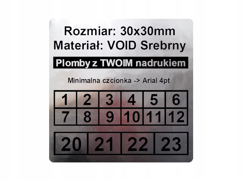 Oferujemy wykonanie 1000 sztuk plomb gwarancyjnych w rozmiarze 30mm x 30mm, z materiału srebrny lustrzany VOID.
